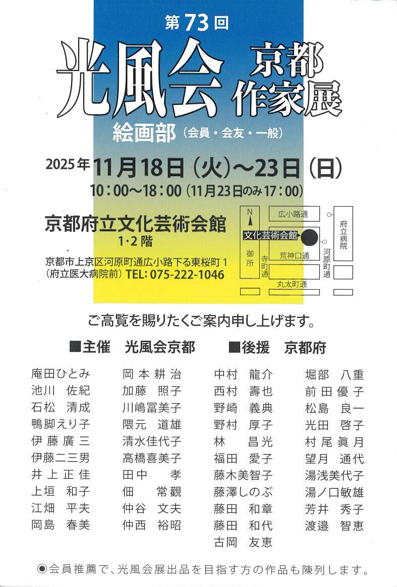 展覧会・個展 一覧 2025年11月 第73回光風会京都作家展 会 期 2025年11月18日(火)〜11月23日(日) 10:00~18:00(11月23日のみ17:00) 会 場 京都府立文化芸術会館1・2階京都府京都市上京区河原町通広小路下る東桜町1(府立医大病院前) tel.075-222-1046 絵画 NEW 全1件中 1件目を表示 全1件中 1件目を表示 ※展覧会、個展の開催初日順に掲載しています。(calendar内の年月カテゴリーは、開催日ではなく掲載日です) ※展覧会の詳細については各会場に直接お問い合わせください。(過去の情報は5年間保管します)